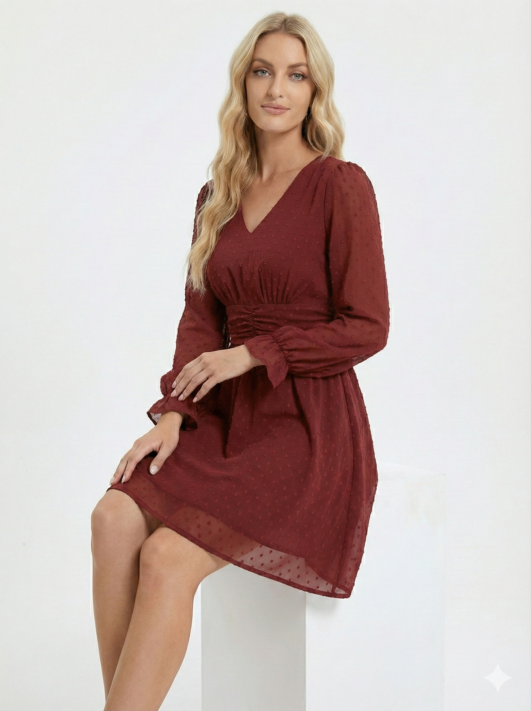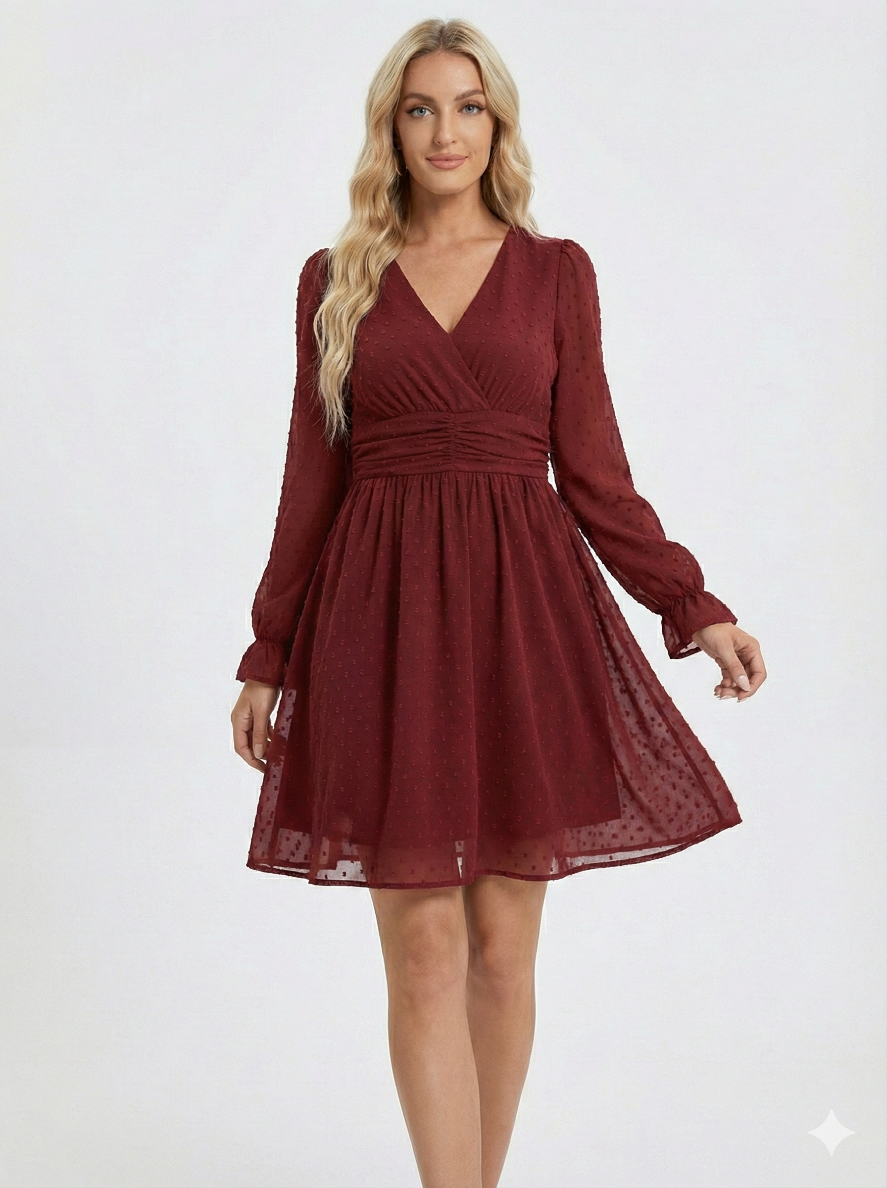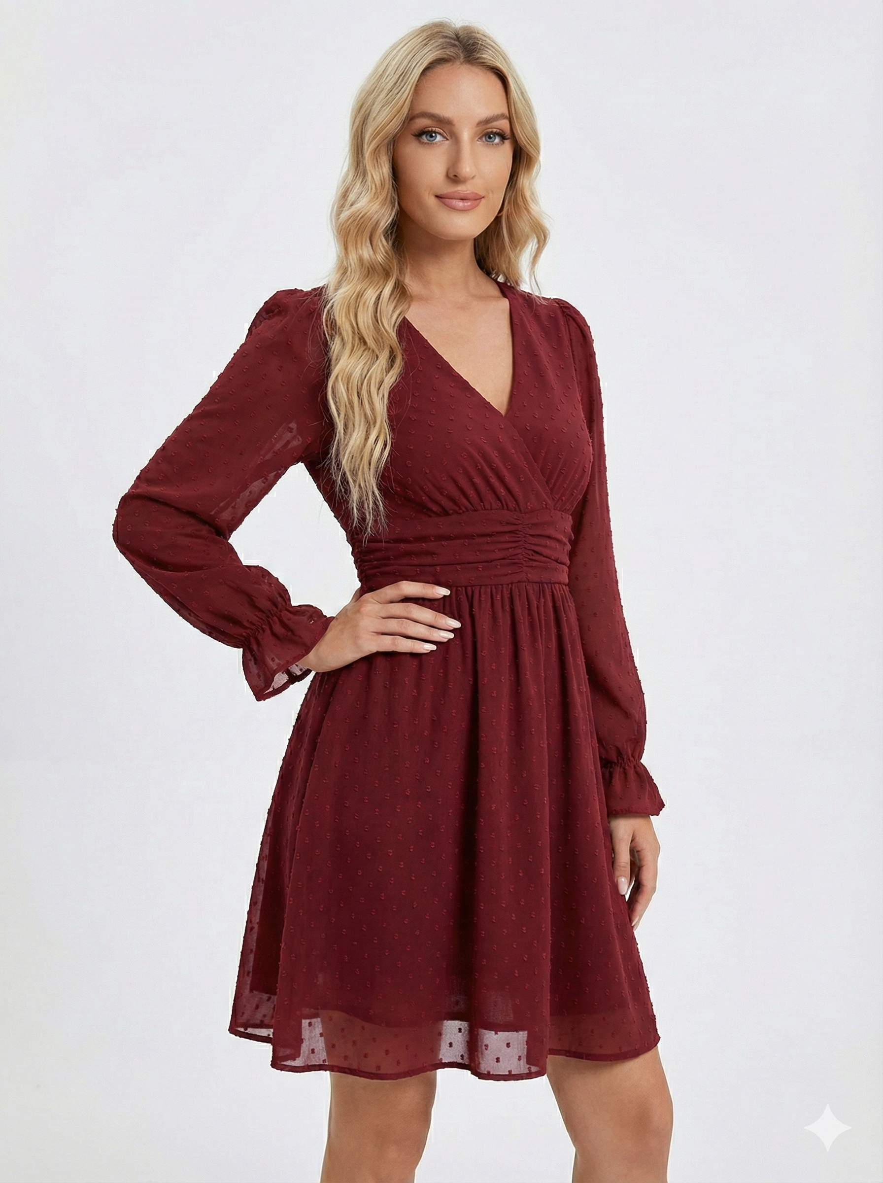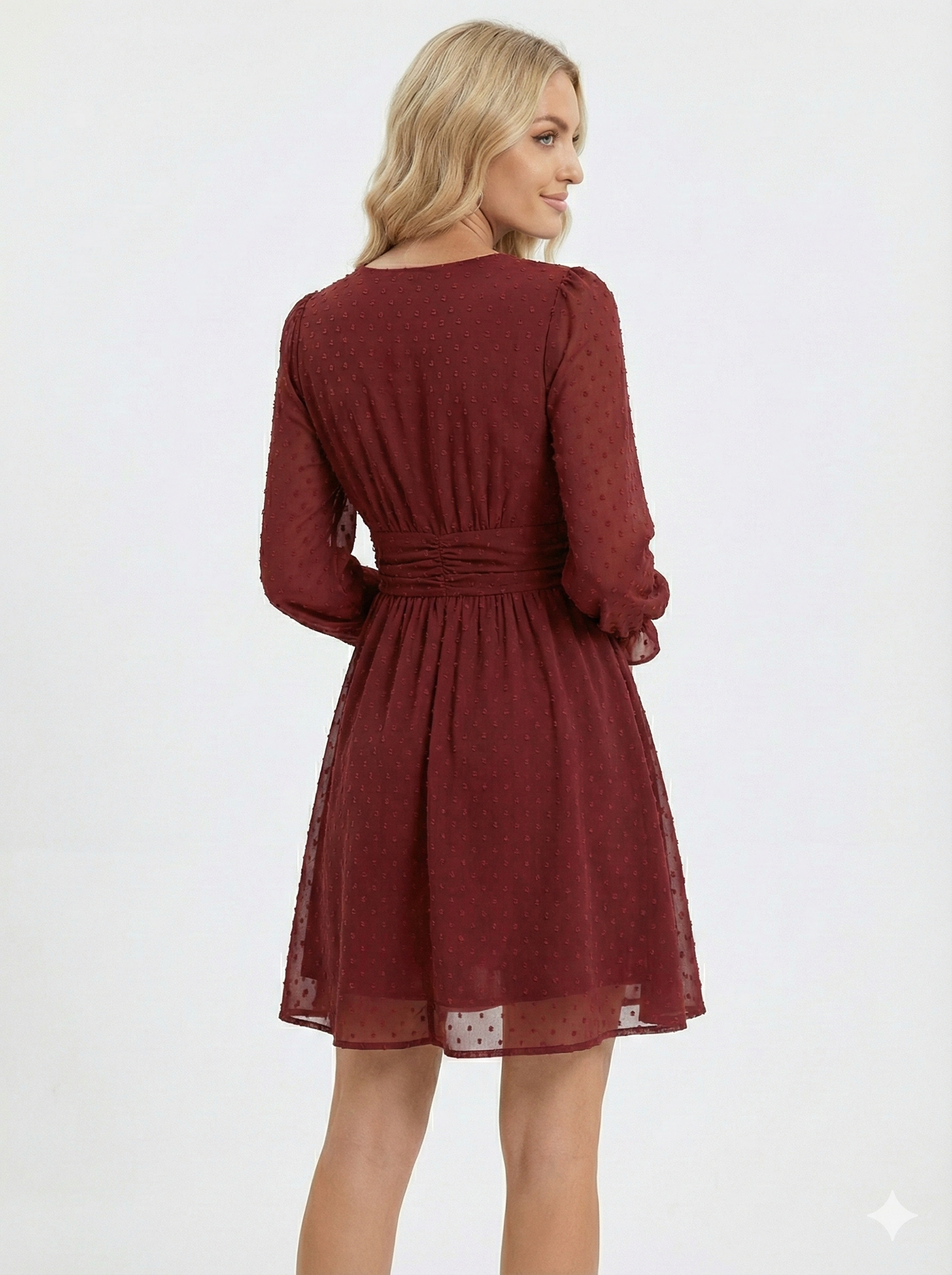 Découvrez notre sublime robe en maille bordeaux, parfaite pour illuminer vos soirées d'hiver. Sa teinte profonde et chatoyante attire tous les regards, tandis que son motif texturé apporte une dimension luxueuse. La coupe évasée avec taille marquée met parfaitement en valeur votre silhouette, complétée par des manches bouffantes tendance et un décolleté en V élégant qui allonge le cou. Le tissu mousseline offre une allure sophistiquée idéale pour toutes vos occasions spéciales.